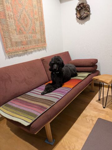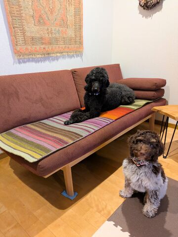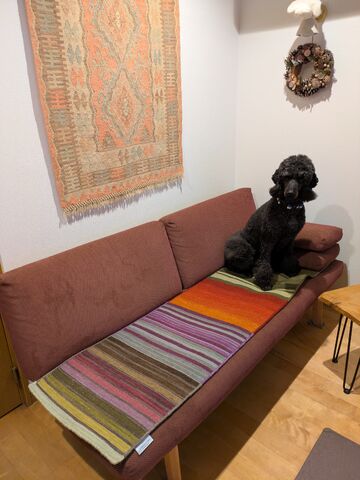 ワンちゃんにも気に入っていただけたようで、とっても嬉しいです。今回選んでいただいた【リバーシブル・ストライプ】シリーズは、名前の通りハグみじゅうたんの中でも唯一の裏表両面使えるタイプになるので、お得感もありますよね。(イエニシリーズも両面使えます)また送っていただいた写真のようにソファの座面にもぴったりですが、軽くて持ち運びも楽なので、ソファの足元に置いてもいいですし、季節や状況に合わせて様々な場所で活躍しそうですね。これからもワンちゃんたちと一緒にハグみじゅうたんとの思い出もたくさん作ってください!