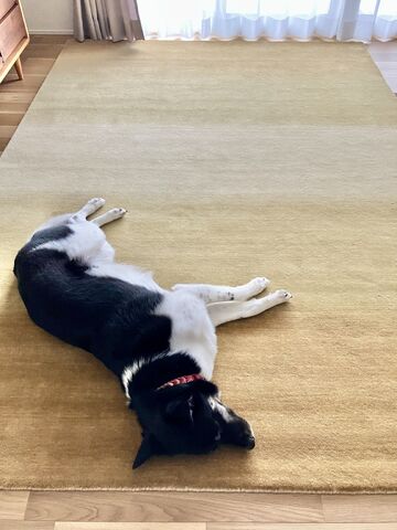 実物を見ずに決めていただいたとのことでしたが、お手元に届いたものがイメージ通りとのことで安心しました。またワンちゃんもハグみじゅうたんの上でとってもリラックスしているのがよくわかりますね!今回選んでいただいたものが170cm×240cmと大きなサイズなので、ワンちゃんと一緒にゴロゴロしたりたくさんの時間を過ごしてください。