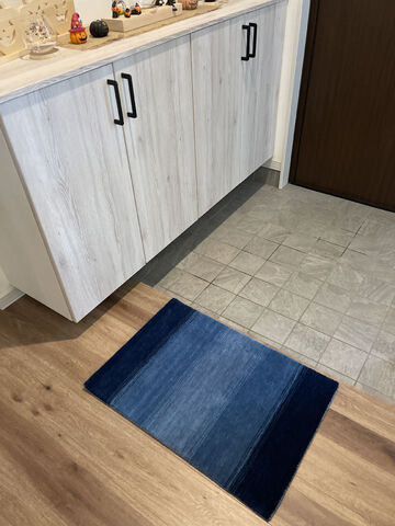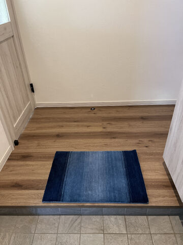 ナチュラルな印象を持たれる方の方が多いハグみじゅうたんですが、M様のエントランスでの、青の凛とした上品さも素敵で、他の皆様にもみていただきたいお写真です。これからの夏時期、裸足での心地よさもお楽しみくださいませ♪