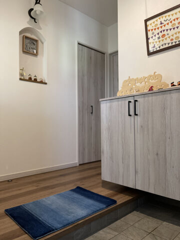 とっても素敵にされている玄関に、青いハグみじゅうたんが映えますね!色の選択で迷われたとのことですが、確かにどんな色でも合いそうですね。今後は季節で色を変えることも検討されているとのことなので、玄関の装飾の一部として楽しみながら検討いただければ幸いです。