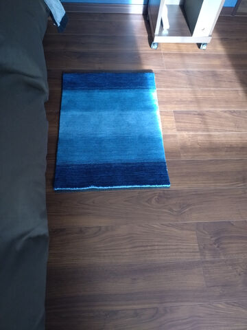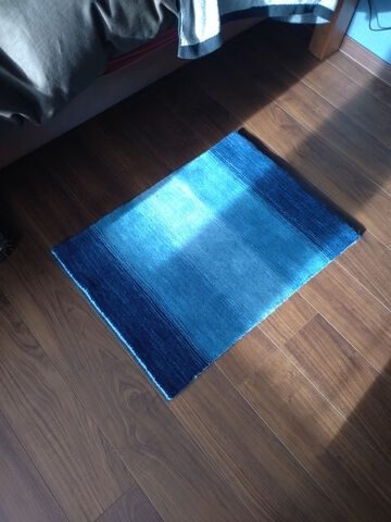 当時は小さ目のを購入しましたが、今回は1番大きいのを選び暖かく感じる色を選択しました。絶対に青がこのフローリングに合うと信じていました。