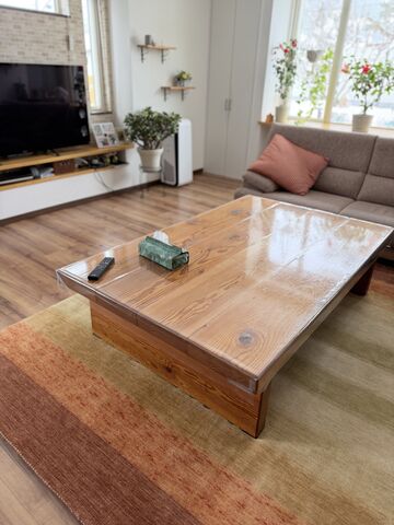 じゅうたんの買い替えは考えられていたようですが、たまたまランチで入ったお店でハグみじゅうたんを見つけていただいたのは、とっても嬉しいです。こだわりを感じられる天然木のリビングテーブルや重厚感のある床材にハグみじゅうたんが違和感なく馴染んでいて、本当に素敵な空間ですね。サイズもLサイズを選んでいただいたので、ぜひハグみじゅうたんの上でもたくさんの時間を過ごしていただければ幸いです。