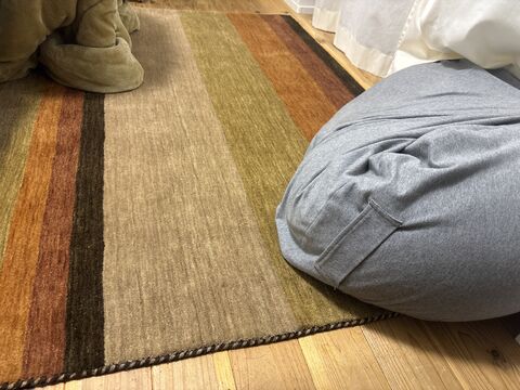 ハグみじゅうたんは裏地をつけておらず、調湿性抜群のウールで作っているため通気性が良いので、無垢の床にもおすすめしております。