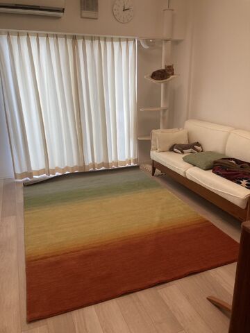 部屋の模様替えに伴って、ラグを探していたところ、インスタでハグみじゅうたんに出会い、お店に伺って、たくさんのラグを見せていただき、海に沈む夕陽をイメージした多色使いのグラデーションの素敵なラグに決めました。サイズも雰囲気もぴったりマッチして、とても気に入っています。暑い時期ですが、裸足でラグに足を乗せるととても心地いいです。