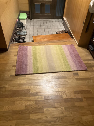 玄関マットを久々に新しい物に。なかなかいい物がなくハグみじゅうたんさんの色づかいにすごい綺麗だなぁーとネットで購入しようとしましたが、たまたま近く北千住にハグみじゅうたんさんが来てる事を知り、実際はすぐ気に入り購入しました。大切に使わせてもらいます。素敵な玄関マットありがとうございました(*^_^*)