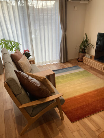 ナチュラルで落ち着いた空間に、レインボーのハグみじゅうたんがアクセントになり、とっても素敵ですね。ハグみじゅうたんはウール素材ですが、一年中快適に使っていただけますので、季節によって敷く向きを変えることで、お部屋の雰囲気を変えることもできます。またA様がおっしゃられるように、耐久年数も長いので、これからもハグみじゅうたんと共に、たくさんの素敵な時間をお過ごしいただければ幸いです。