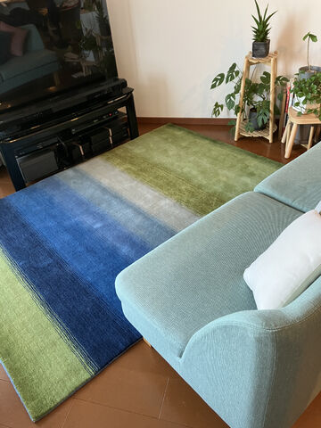 肌に触れる毛足(パイル)部分はウール100%の天然素材で、柔らかくふかふかした感触が良いです。天然素材ならではの肌触りの良さと、寝転びたくなる厚みで、寝転ぶと気持ちがいいです。自然の風景をモチーフにした彩り豊かなグラデーションデザインで、住まいに馴染む色合いで、ホッと癒されます。快適な肌触りと実用性を兼ね備えた、長く愛用できる高品質なラグだと思います。
