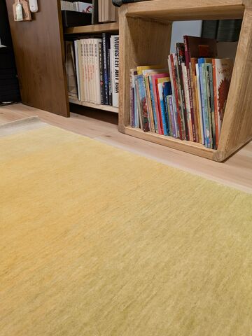 イエローと黄緑ですと明るい印象があるかと思いますが、ハグみじゅうたんは手仕事でじっくりと色を染めているので、自然な染まり具合が特徴的です。