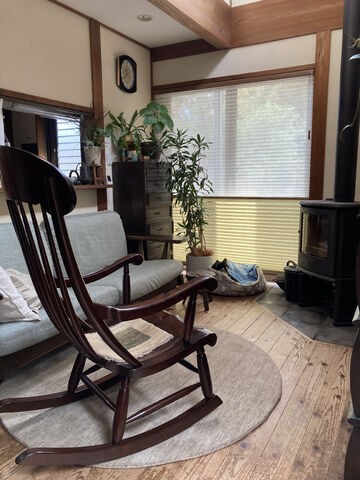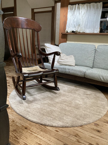 ロッキングチェアの下にハグみじゅうたん【てざわりプレーン】シリーズのサークルタイプがとっても素敵ですね!厚みがあるのでふかふかなのはもちろんですが、その上に今回のように椅子やテーブルなどの家具を置いても跡になりにくいですし、跡がついてもしっかりと復活しますので、安心してロッキングチェアでたくさんの素敵な時間を過ごしてください!