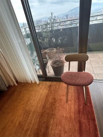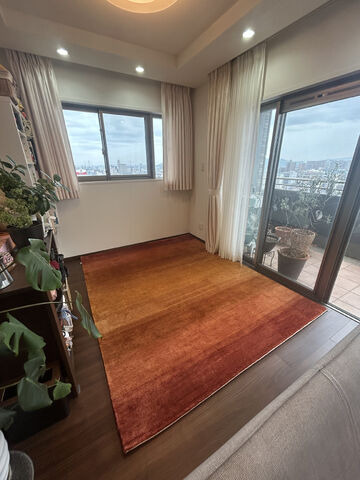 今回選んでいただいたのは一番大きいサイズなので、赤の大きいじゅうたんと考えると派手なのかなー。と感じてしまいますが、敷いてみると主張しすぎることもなく馴染んでいますし、たくさん育てられているグリーンも映えて相性がいいですね!また【ておりセカンドコレクション】シリーズは、厚みもあるので踏み心地もふかふかで気持ちがいいので、これからもハグみじゅうたんの上でたくさんの素敵な時間を過ごしていただければ幸いです。