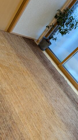 シンプルナチュラルな優しい色あいはウールの素材感がより引き立つと思います。おっしゃる通り濃いブラウンがアクセントになってくれていますね、永くお楽しみいただけたら幸いです。これから馴染んで、S様ご家族の毎日をより彩るラグになりますように…。