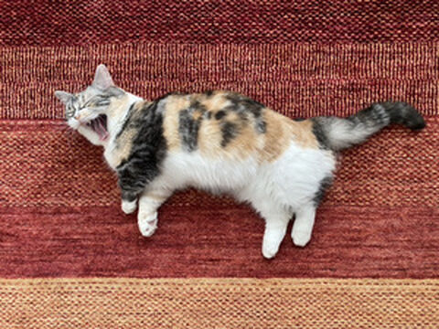 猫ちゃんも、じゅうたんの上が定位置かのように座っていますね。