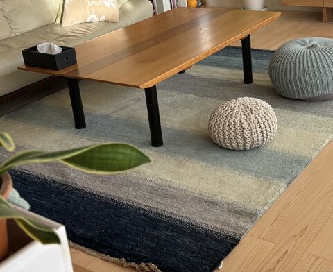 ハグみじゅうたんは天然素材なので、無垢の床材には間違いなく合うのですが、最初は無垢材の心地よさも堪能したいですよね。今回は玄関にも青系のハグみじゅうたんを迎えていただき、玄関からリビングも見えるため、それぞれ品番は違いますがどちらも青系なので統一感がありますね。リビングに敷いてみると温かみが増したとのこと。たくさんの観葉植物や素敵なインテリアと調和した結果、そう感じていただけたのかもしれませんね。また【ており】シリーズは敷く向きによっても印象が変わるため、季節によってじゅうたんの向きを変えたりしながら、これからもハグみじゅうたんのある暮らしをお楽しみください。