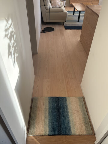 リビングにはておりシリーズ、玄関にはてざわりシリーズを選んでいただいているので、それぞれの手触りの違いもお楽しみいただけているのではないでしょうか。また複雑に色が混ざり合いながらグラデーションになっているので、近くで見ることで新たな発見があったりします。とっても素敵なソファもお持ちではありますが、ぜひハグみじゅうたんの上でもたくさんの時間を過ごして頂き、素敵な思い出を作っていただければ幸いです。