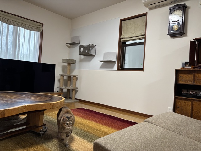 一枚板を使用したテレビボードやリビングテーブルといった、重厚感のあるインテリアにハグみじゅうたんがとっても合っていますね!キャットタワーやキャットウォークなど、猫ちゃんが遊べるスペースも写真に写っていますが、このハグみじゅうたんも猫ちゃんのお気に入りのスペースになったら嬉しいです。これからもハグみじゅうたんのある暮らしを存分にお楽しみください!