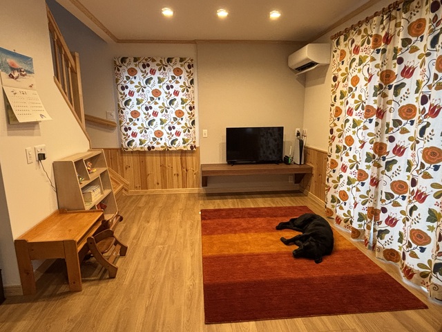 お部屋の雰囲気やカーテンとも合っていて、とっても素敵ですね!ワンちゃんもハグみじゅうたんの上でリラックスしてくれているようで嬉しいです。おススメしてくださったハウスメーカーさんのおっしゃる通り、ハグみじゅうたんのウールはうろこ状の表皮でコーティングされていたり、目が詰まった造りのため汚れやごみが中に入りにくく、お手入れも簡単なので、ワンちゃんなどのペットや赤ちゃんがいるご家庭でも、安心して使っていただけます。これからもハグみじゅうたんの上でたくさんの時間を過ごしていただき、楽しい思い出を作ってください!
