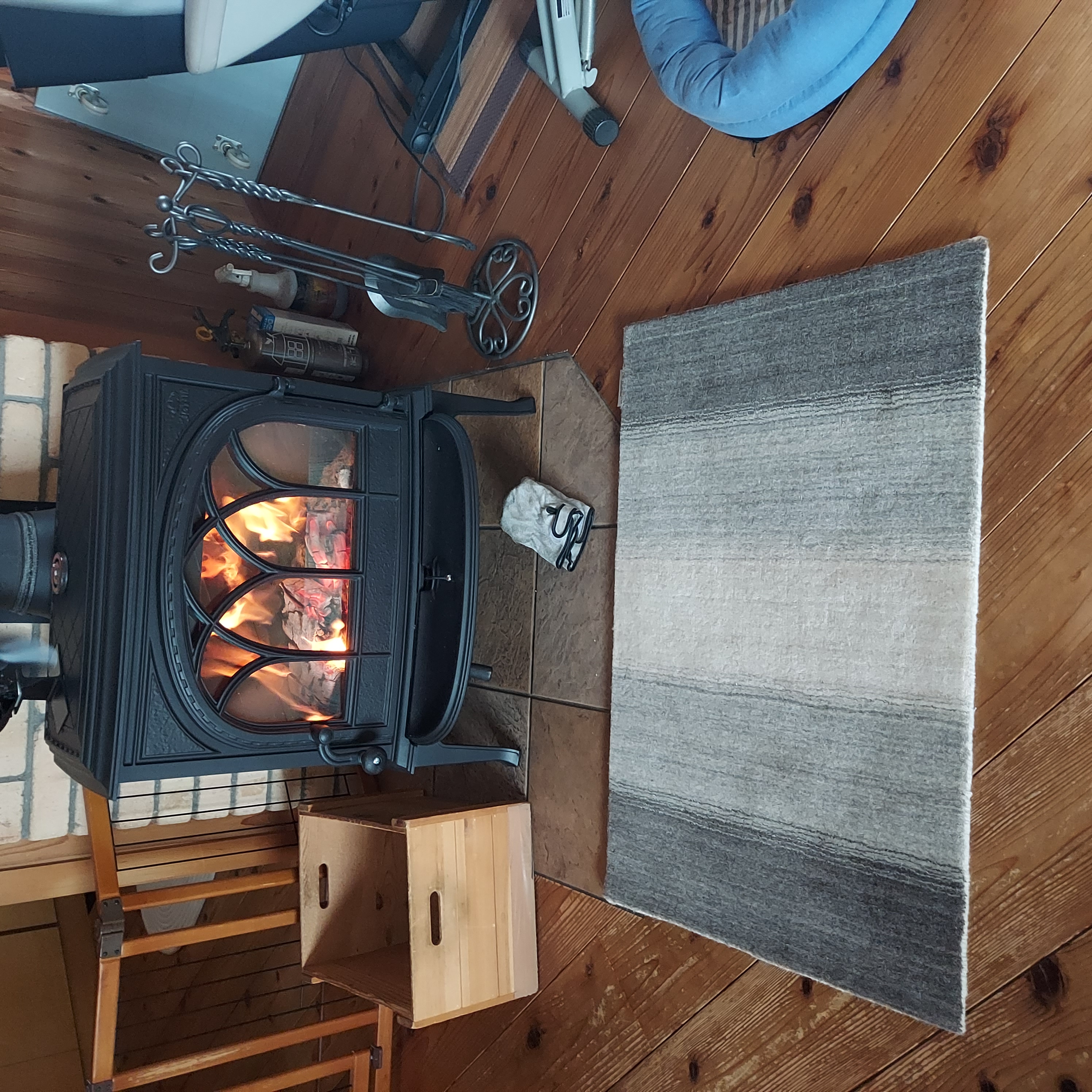 無垢材の床に薪ストーブというスペースには間違いなくハグみじゅうたんが合いますね!薪ストーブの前には薪をくべるときや火をつけるときなどに、万が一火の粉が飛んでも燃え広がらないようにウール素材のラグを敷かれることが多いですが、てざわりシリーズなら厚みもあるためふかふかで手触りもいいため、そのままじゅうたんの上で炎を見ながらのんびり過ごしたりもできそうですね。また薪ストーブを使わない季節には、別の場所でフロアクッションとして使っていただくこともできますので、一年中様々な場所で使っていただければ幸いです。