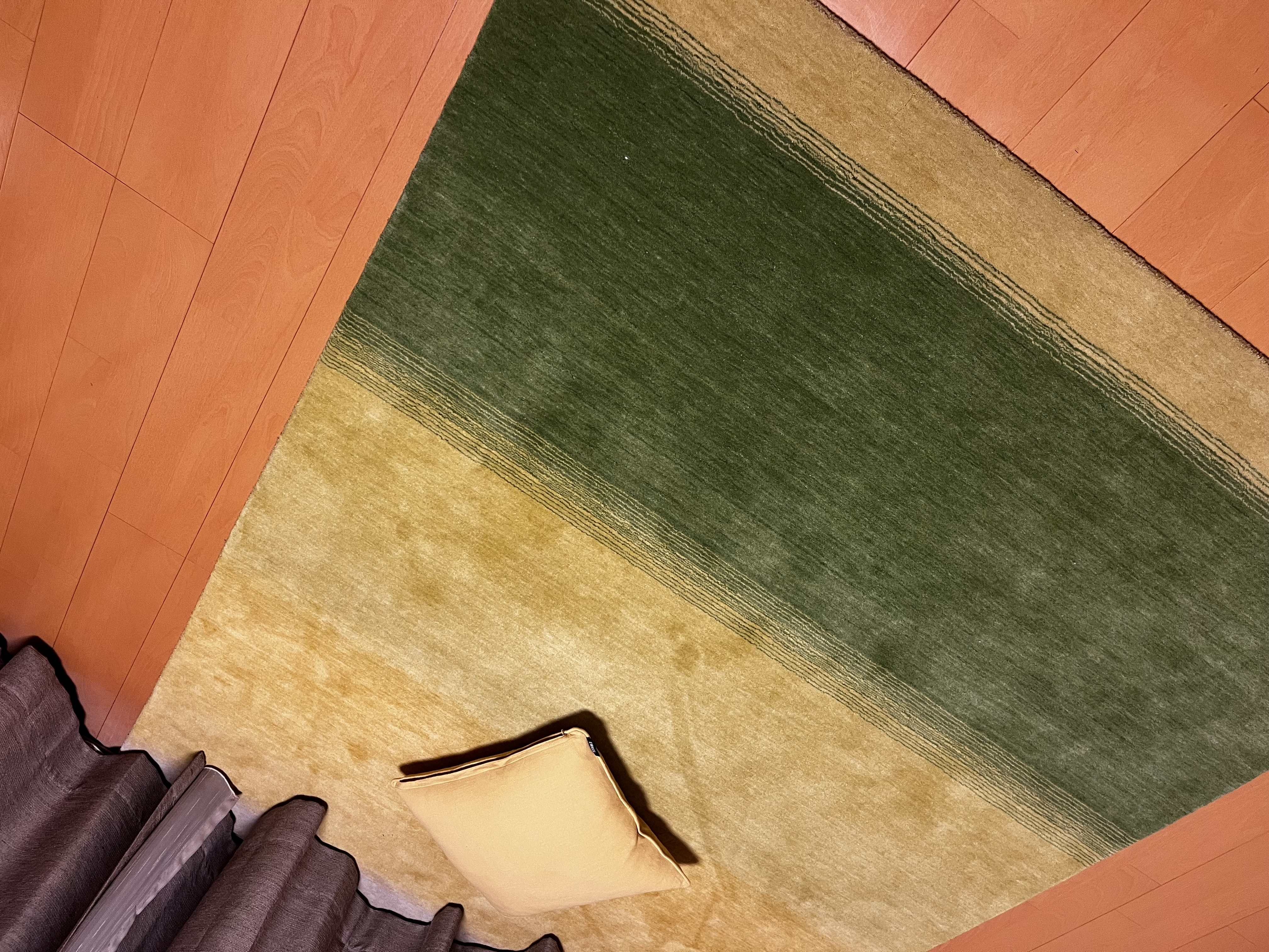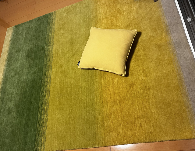 グリーンとイエローのグラデーションのラグを探していたらハグみじゅうたんに出会えました!室内側をグリーン屋外側にイエローと室内の明るさを意識して使用しています。曇りの日はグリーンが深く落ち着いたカラーに感じられ、晴れの日はイエローが映え暖かさを感じられますまだ使用して2ヶ月程度なのでこれからが楽しみです!