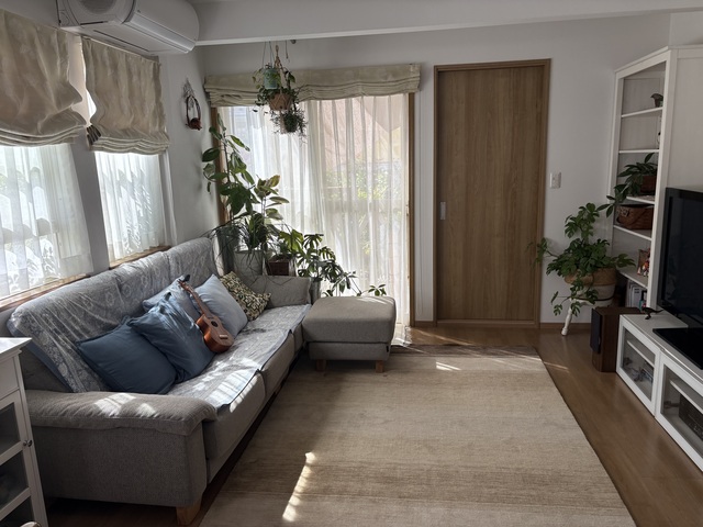 今回迎え入れていただいたハグみじゅうたんは、前からあったかのように馴染んでいますね。床や建具、カーテンと調和しつつ、たくさんの観葉植物も映える本当に素敵な空間ですね。ハグみじゅうたんはウール素材ですが、湿気を吸ったり吐いたりという調湿作用があるため、夏でもさらっと快適に、もちろん冬は暖かく、通年快適に使っていただけますので、これからもハグみじゅうたんと共に心地よい時間をお過ごしください。
