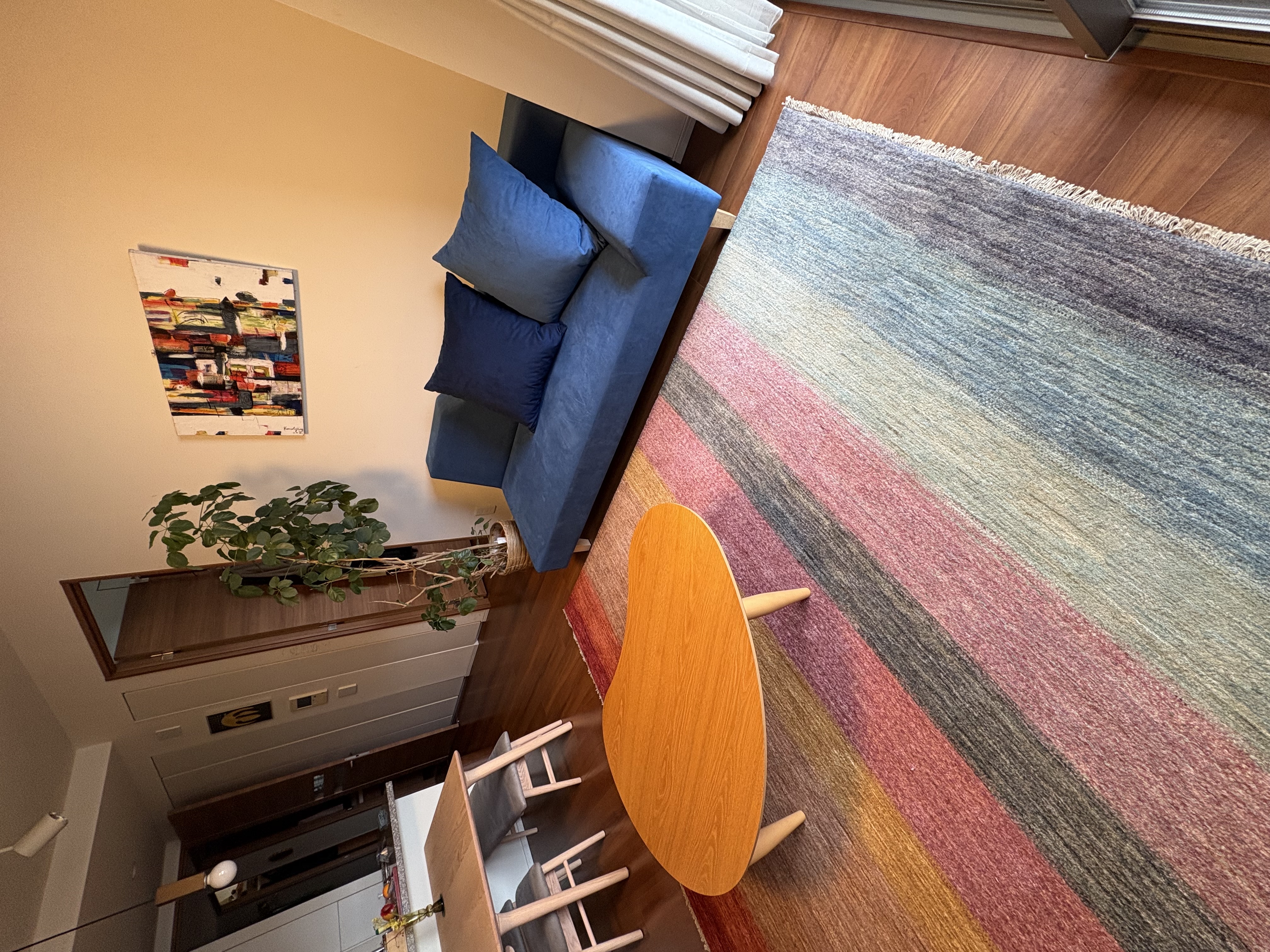 年齢が上がって身長が低くなり、ソファとダイニングテーブルを身長に合わせて変えました。それに併せてじゅうたんも新調しました。リビングコーナー全体を覆う大きさにしたので、素足になれる面積が広がって気持ちよいです。はぐみじゅうたんは、カラフルなのに目に優しく家具と調和して飽きないのがとても気に入っています。