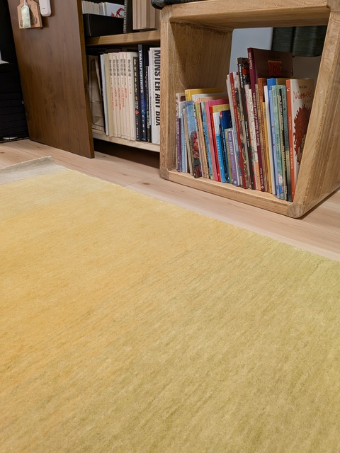 ちぎり絵の展示会を見に店舗を訪ねた際、同時期に開催していたじゅうたん展で、存在を知りました。実際の色を見て、その手触りも感じられたので、購入や使用をジブンゴトとして考えやすかったです。稲穂のような緑と黄の色と、たっぷり安心できる厚みが決め手です。日向ぼっこと本を愉しむ緑の居間、とても嬉しいです。