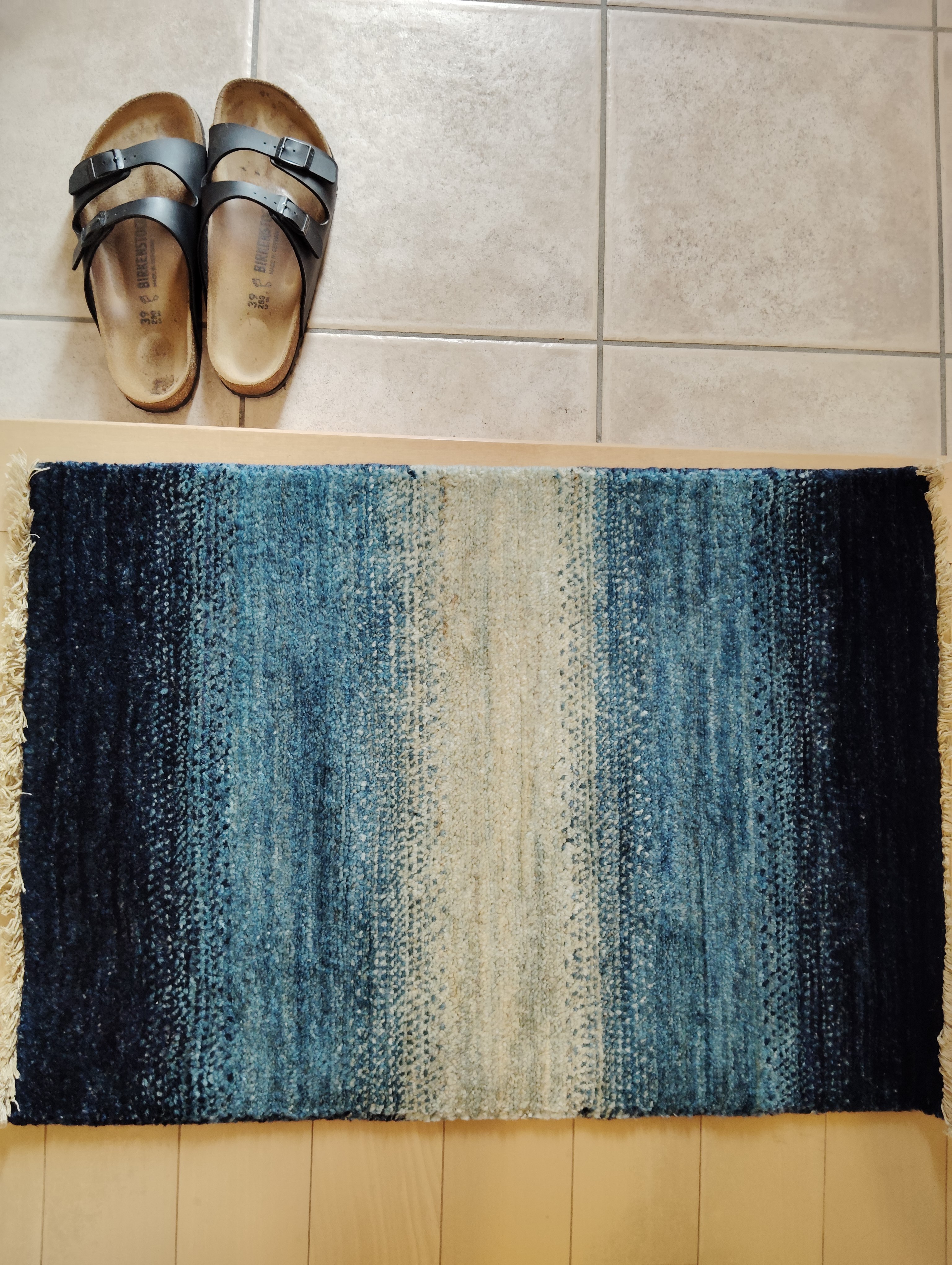 明るい色味の玄関に青のグラデーションのハグみじゅうたんが、空間を引き締めてくれて、とっても素敵ですね。シリーズや柄などたくさんある中から1枚を決めるのは大変なことですが、良い選択ができたとのこと、そして奥様、お嬢様にも気に入っていただけたのは、大変嬉しいです。夏は素足で上がるのがとっても気持ちがいいので、寒い季節はもちろん暑い季節もハグみじゅうたんのある暮らしをお楽しみくださいませ。