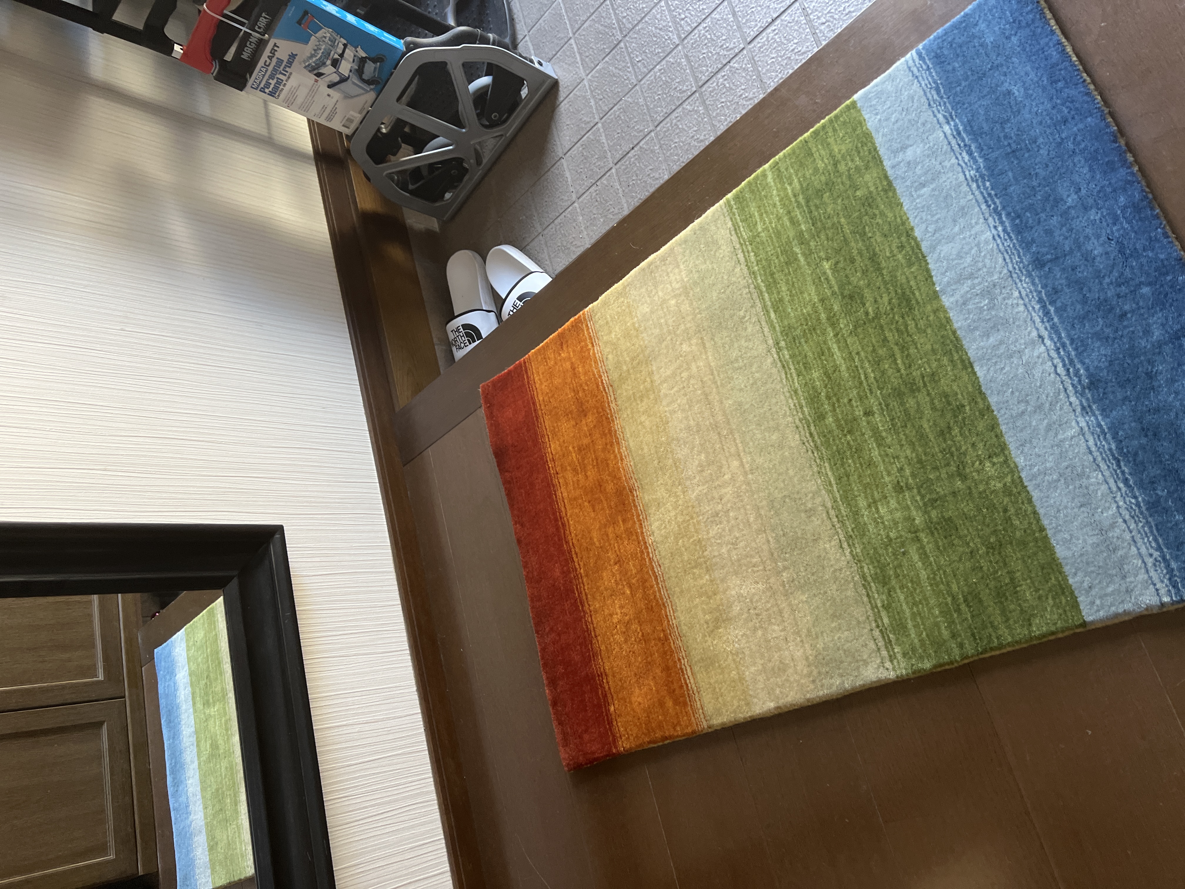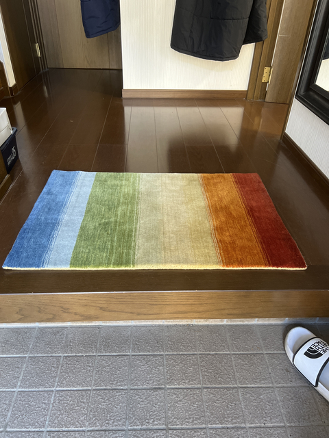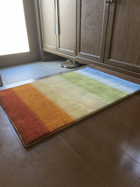床が落ち着いた色味なので、ER6190のレインボーカラーが映えますね。日本人にとってじゅうたんは少し手の届かないもののように感じてしまうかもしれません。またその中でもペルシャ絨毯は手が込んでいて高価なものがあるのも事実ですが、まずは知っていただくことがとても大切だと感じます。今回選んでいただいたハグみじゅうたんは、『造り』『健康』『環境』をコンセプトに作られています。これからも毎日玄関でたくさん見て、触れて、ハグみじゅうたんのある暮らしをお楽しみください!